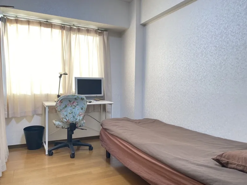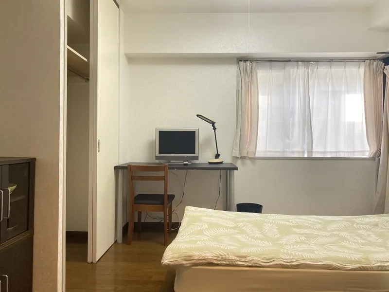 大きな窓があり、明るいお部屋です。壁はクロス貼り、床はフローリングで、清潔感のある室内。大きなクローゼットも備えており、収納にも便利です。
