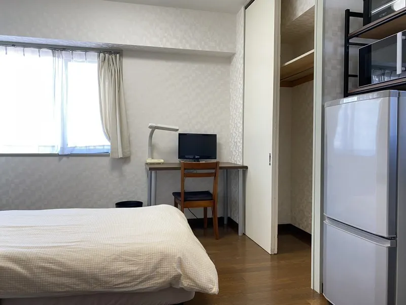 大きな窓があり、明るいお部屋です。壁はクロス貼り、床はフローリングで、清潔感のある室内。大きなクローゼットも備えており、収納にも便利です。